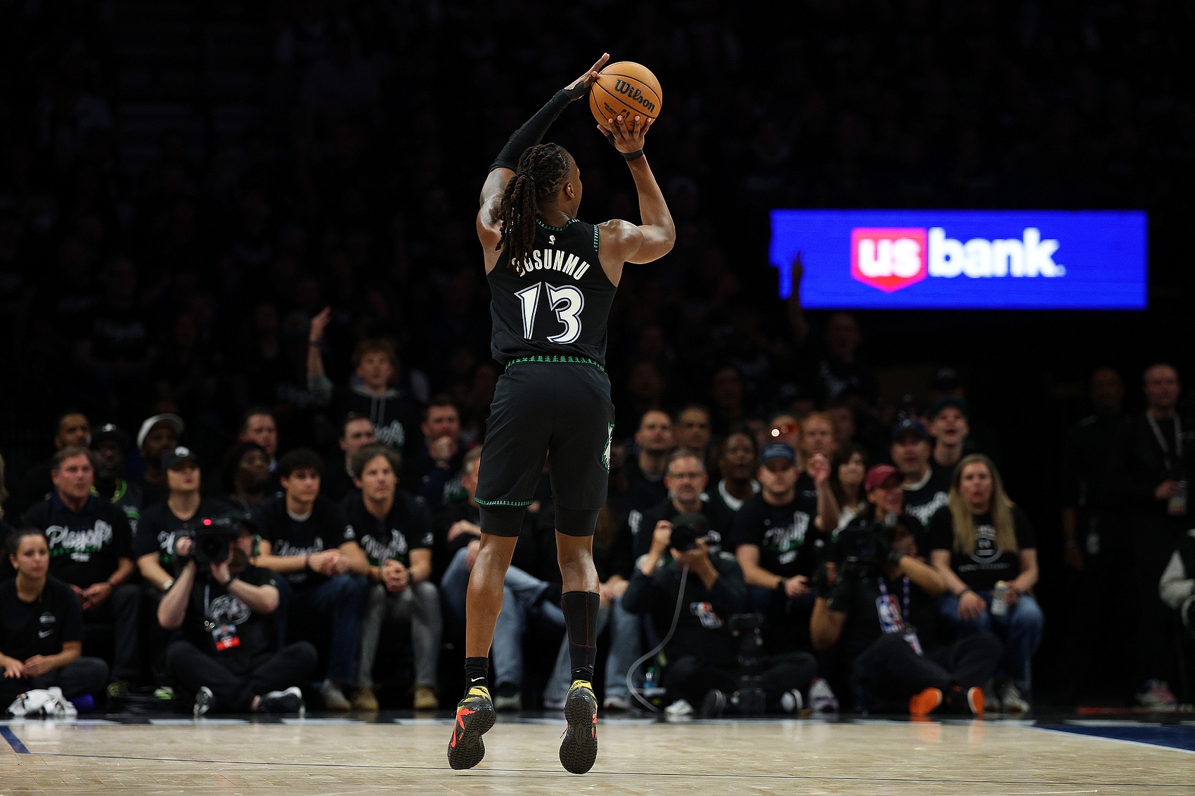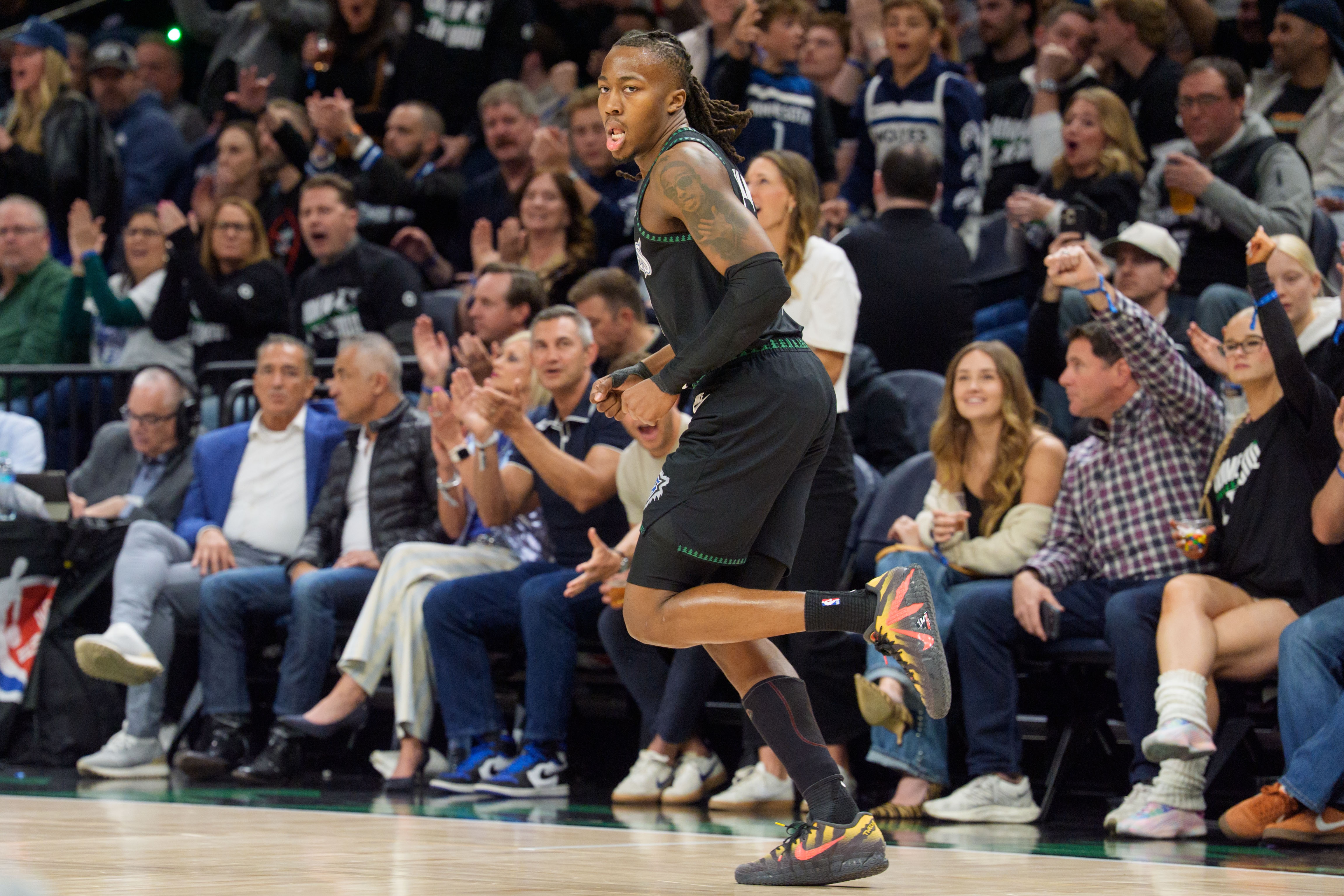 迪文岑佐开场1分19秒无对抗伤退,华子开场6中1,许多平时手拿把攥的空位中距离都投丢,手感不佳。森林狼的进攻实则依靠兰德尔背打抓错位吸引夹击,联动道苏姆和海兰德的乱战能力以及麦克丹尼尔斯的冲抢活力撑起局面。