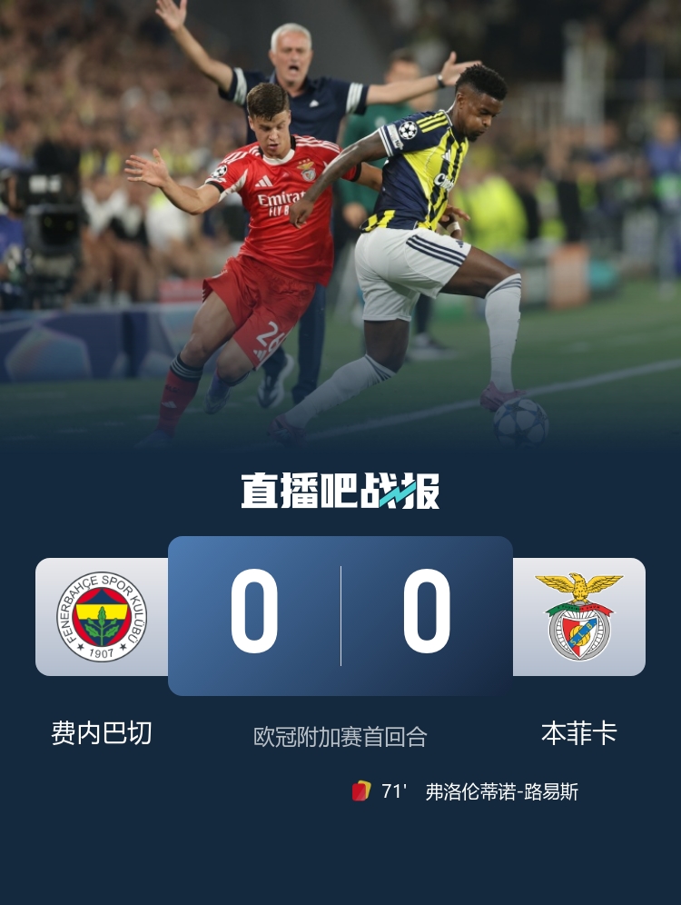 欧冠附加赛首回合激战,费内巴切与十人本菲卡0-0握手言和,恩内斯里进球被判无效
